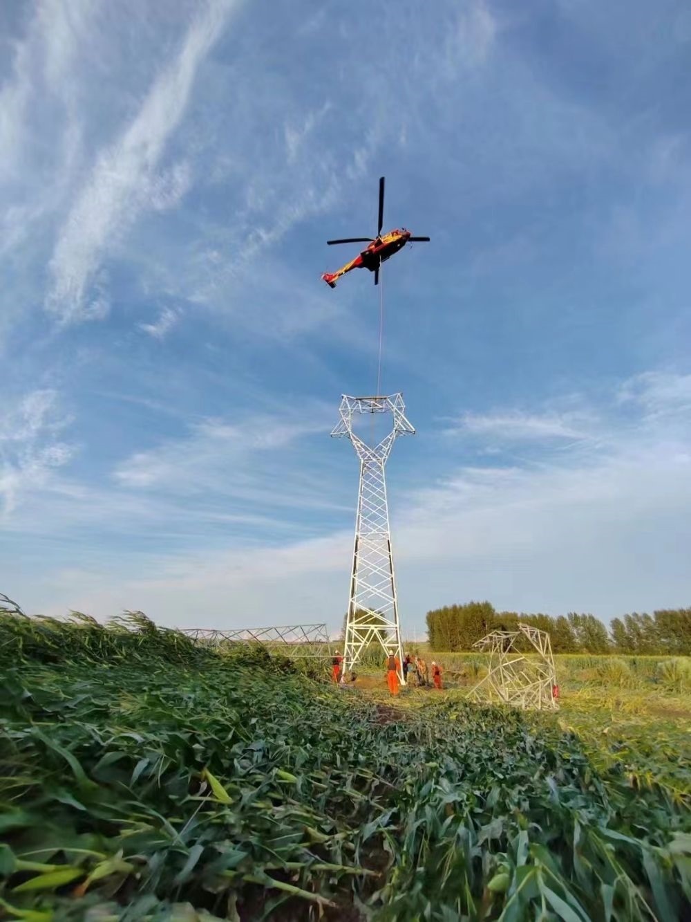 9日,在海林市110千伏長海輸電線路搶修現(xiàn)場,一架直升機(jī)吊裝起沉重的輸電鐵塔,運送到指定地點。這個輸電鐵塔處于河流中心島位置,無法使用常規(guī)起重設(shè)備。國家電網(wǎng)公司迅速從國網(wǎng)遼寧電力、國網(wǎng)空間技術(shù)公司等單位調(diào)配直升機(jī)支援黑龍江,解決輸電鐵塔吊裝、運輸?shù)葐栴}。