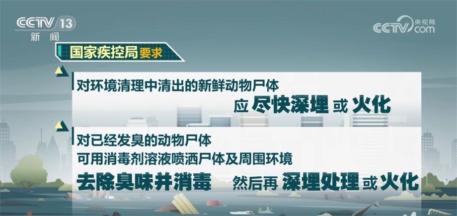 對(duì)環(huán)境清理中清出的新鮮動(dòng)物尸體應(yīng)盡快深埋或火化,對(duì)已經(jīng)發(fā)臭的動(dòng)物尸體,可用消毒劑溶液噴灑尸體及周圍環(huán)境,去除臭味并消毒,然后再深埋處理或火化。