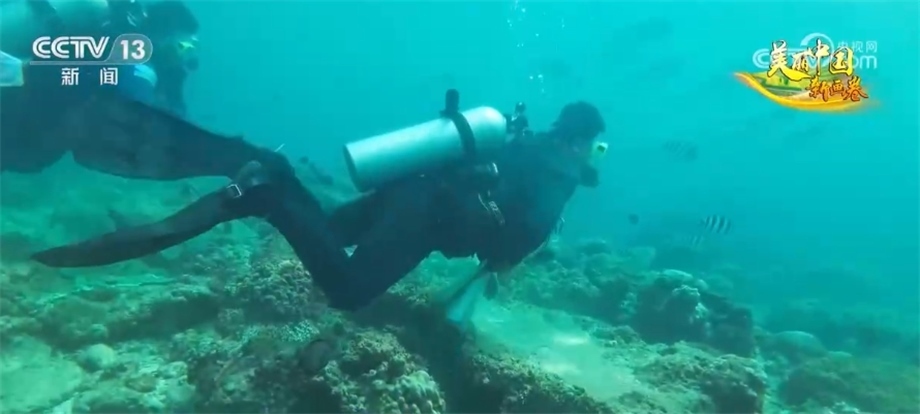 總臺(tái)央視記者 焦?。?/strong>我現(xiàn)在位于海南三亞蜈支洲島,在我身旁的這片海域就是我國的第一個(gè)熱帶海洋牧場(chǎng)。這段時(shí)間,海洋牧場(chǎng)正在進(jìn)行珊瑚移植和調(diào)裝魚礁的工作。我們帶著水下攝像機(jī),跟隨著工作人員一起進(jìn)入海底,體驗(yàn)在海里如何“植樹造林”。