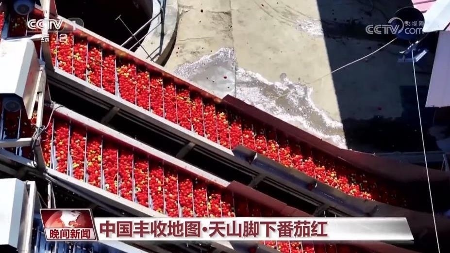 八月的新疆,天山腳下,大地被暈染成紅色。番茄又到了成熟的季節(jié)。采收機和拉運車在田間齊頭并進,忙碌不停。