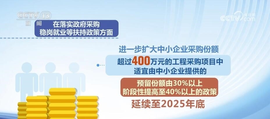 在落實(shí)政府采購、穩(wěn)崗就業(yè)等扶持政策方面,進(jìn)一步擴(kuò)大中小企業(yè)采購份額,超過400萬元的工程采購項(xiàng)目中適宜由中小企業(yè)提供的,預(yù)留份額由30%以上階段性提高至40%以上的政策延續(xù)至2025年底;中小微企業(yè)招用符合條件的畢業(yè)年度或離校2年內(nèi)未就業(yè)高校畢業(yè)生、登記失業(yè)青年,簽訂1年以上勞動(dòng)合同的,可按規(guī)定申請(qǐng)一次性吸納就業(yè)補(bǔ)貼;符合條件的中小微企業(yè)可按不超過企業(yè)及其職工上年度實(shí)際繳納失業(yè)保險(xiǎn)費(fèi)的60%申請(qǐng)失業(yè)保險(xiǎn)穩(wěn)崗返還;對(duì)招用畢業(yè)年度和離校2年內(nèi)未就業(yè)高校畢業(yè)生的小微企業(yè),按規(guī)定落實(shí)社會(huì)保險(xiǎn)補(bǔ)貼政策。