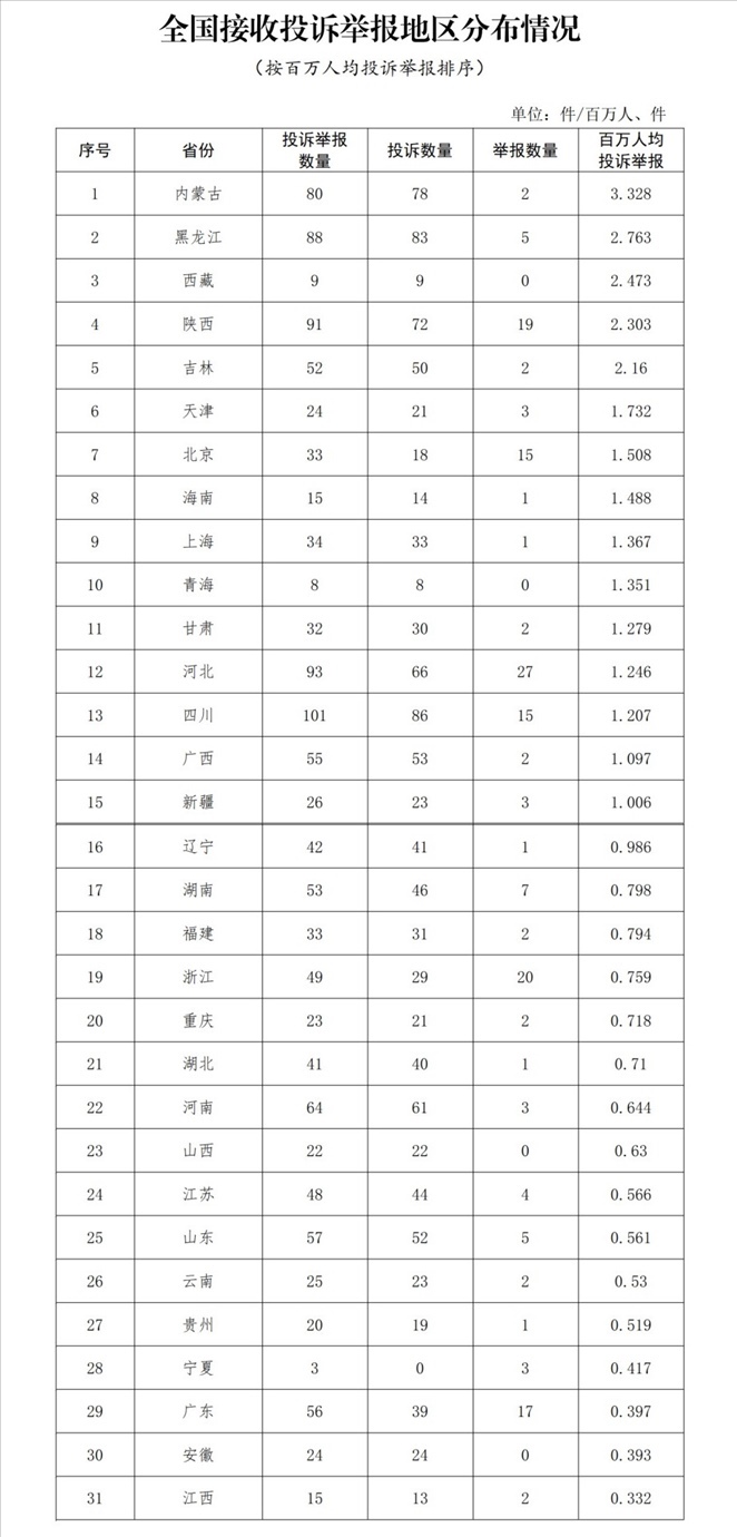 各省(自治區(qū)、直轄市)按照接收投訴舉報(bào)數(shù)量排序,四川、河北、陜西、黑龍江、內(nèi)蒙古排在全國前5位。其中:按投訴數(shù)量排序,四川、黑龍江、內(nèi)蒙古、陜西、河北排在全國前5位;按舉報(bào)數(shù)量排序,河北、浙江、陜西、廣東、北京(四川并列)排在全國前5位;按百萬人均投訴舉報(bào)數(shù)量排序,內(nèi)蒙古、黑龍江、西藏、陜西、吉林排在全國前5位。(全國接收投訴舉報(bào)地區(qū)分布情況詳見附件1)