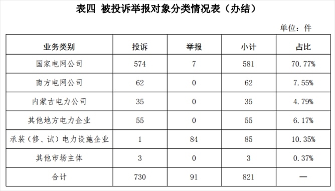 從被投訴舉報(bào)對(duì)象看,供電企業(yè)733件、占投訴舉報(bào)總數(shù)的89.28%,其中國家電網(wǎng)公司581件、占比70.77%,南方電網(wǎng)公司62件、占比7.55%,內(nèi)蒙古電力公司35件、占比3.65%,其他地方電力企業(yè)55件、占比6.17%;承裝(修、試)電力設(shè)施企業(yè)85件、占比10.35%;其他市場主體3件、占比0.37%。