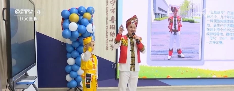 在南寧市魯班路小學(xué),同學(xué)們領(lǐng)略了獨(dú)具壯族特色的體育活動《迪尺小課堂》。同學(xué)們還在開學(xué)典禮上身穿自己設(shè)計(jì)制作的扎染服飾,手拿親手制作的紅陶、皮影等非遺作品,表演了一場非遺秀。