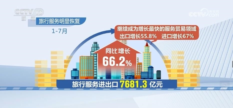 旅行服務(wù)明顯恢復。1月—7月,旅行服務(wù)進出口7681.3億元,同比增長66.2%,繼續(xù)成為增長最快的服務(wù)貿(mào)易領(lǐng)域。其中,出口增長55.8%、進口增長67%。
