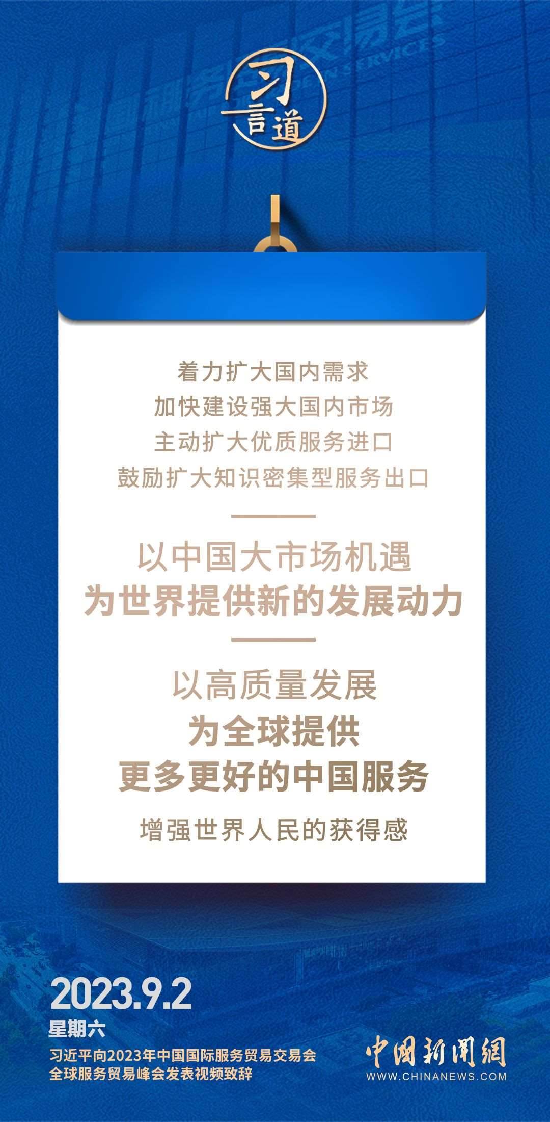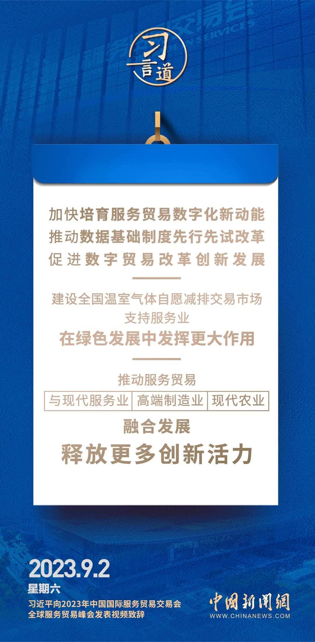 9月2日上午,國家主席習近平在北京向2023年中國國際服務貿(mào)易交易會全球服務貿(mào)易峰會發(fā)表視頻致辭。習近平指出——