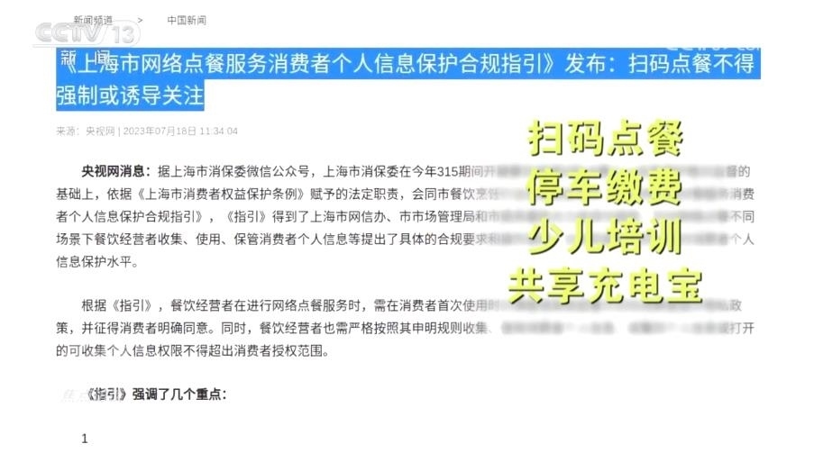 為了加強(qiáng)個(gè)人信息保護(hù),上海市消保委自7月起針對(duì)掃碼點(diǎn)餐、停車(chē)?yán)U費(fèi)、少兒培訓(xùn)和共享充電寶等四種消費(fèi)場(chǎng)景,分別出臺(tái)了合規(guī)指引、自律承諾和合規(guī)清單。未來(lái),還將針對(duì)房產(chǎn)中介、商超購(gòu)物等主要消費(fèi)場(chǎng)景作出相應(yīng)指引。