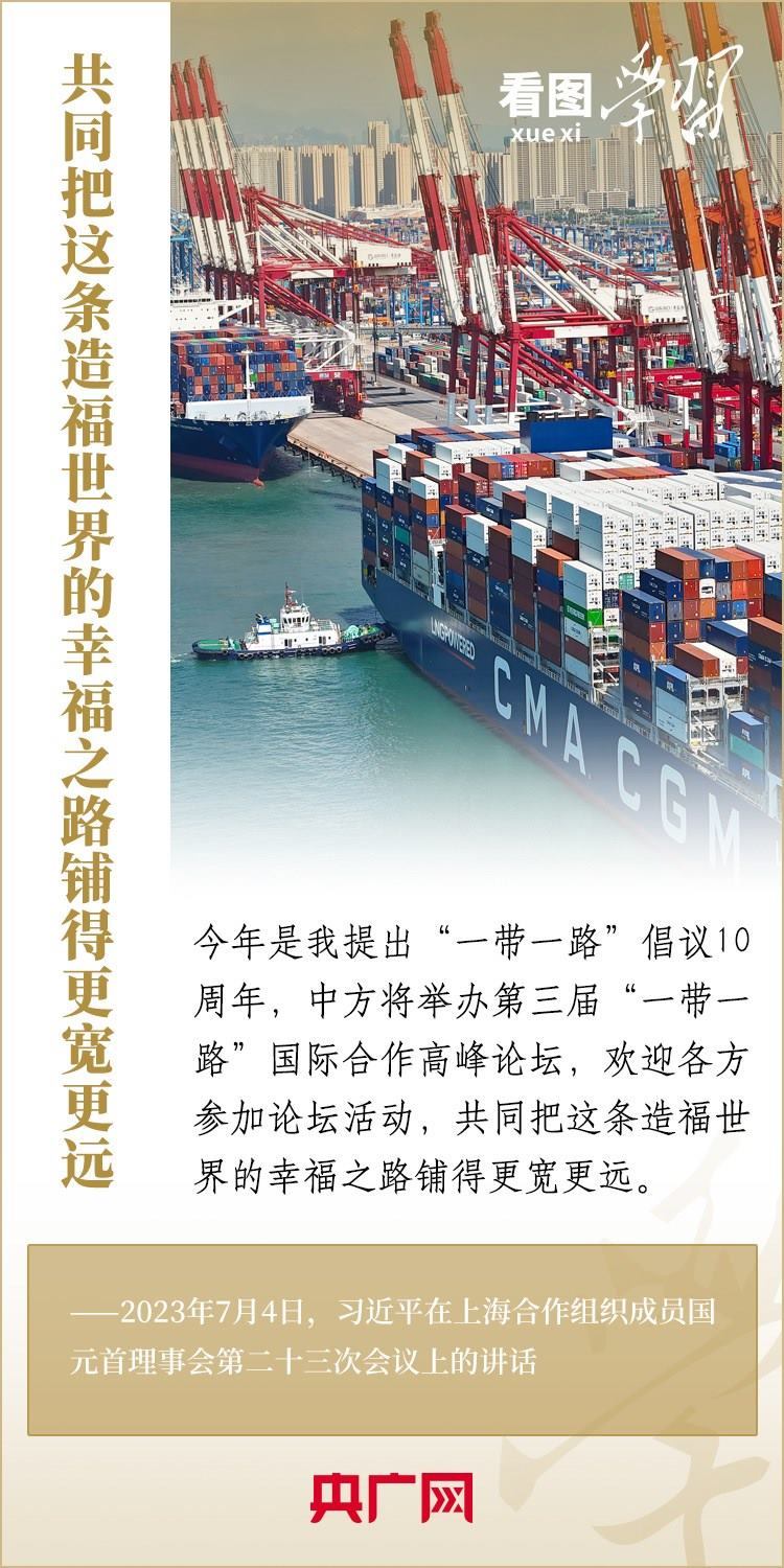 2013年金秋,習(xí)近平主席開創(chuàng)性提出共建“絲綢之路經(jīng)濟(jì)帶”和“21世紀(jì)海上絲綢之路”,即“一帶一路”倡議。十年來,共建“一帶一路”倡議從共商共建共享的“大寫意”,到精謹(jǐn)細(xì)膩的“工筆畫”,影響力和感召力不斷擴(kuò)大。在“一帶一路”倡議提出10周年之際,《看圖學(xué)習(xí)》為您梳理習(xí)近平主席的一系列重要論述。一起來學(xué)習(xí)!