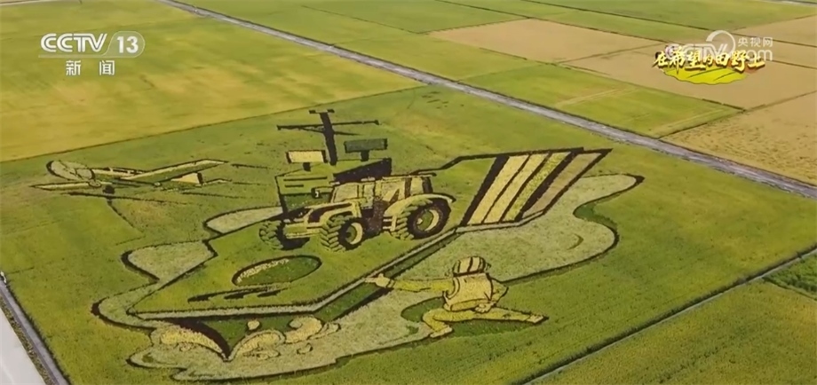 總臺(tái)央視記者 蔣樹(shù)林:金秋9月的稻田是什么顏色的?9月的稻香又是什么味道?來(lái)這里,有可能會(huì)找到您想要的答案。我現(xiàn)在是在黑龍江北大荒閆家崗農(nóng)場(chǎng)。大家來(lái)看,這個(gè)稻田觀景臺(tái)有十多米高,因此站在這里,秋日稻田大片的圖案映入眼簾,今年稻田畫(huà)以“鄉(xiāng)村振興”“數(shù)字農(nóng)業(yè)”為主題,生動(dòng)展現(xiàn)了“讓農(nóng)業(yè)更美好、讓農(nóng)民更幸?!钡拿篮迷妇?。稻田畫(huà)是農(nóng)民們勤勞與智慧的展現(xiàn),他們用稻田畫(huà)為家鄉(xiāng)水稻代言,而對(duì)于在黑土地打拼的北大荒人而言,還有更重要的意義。