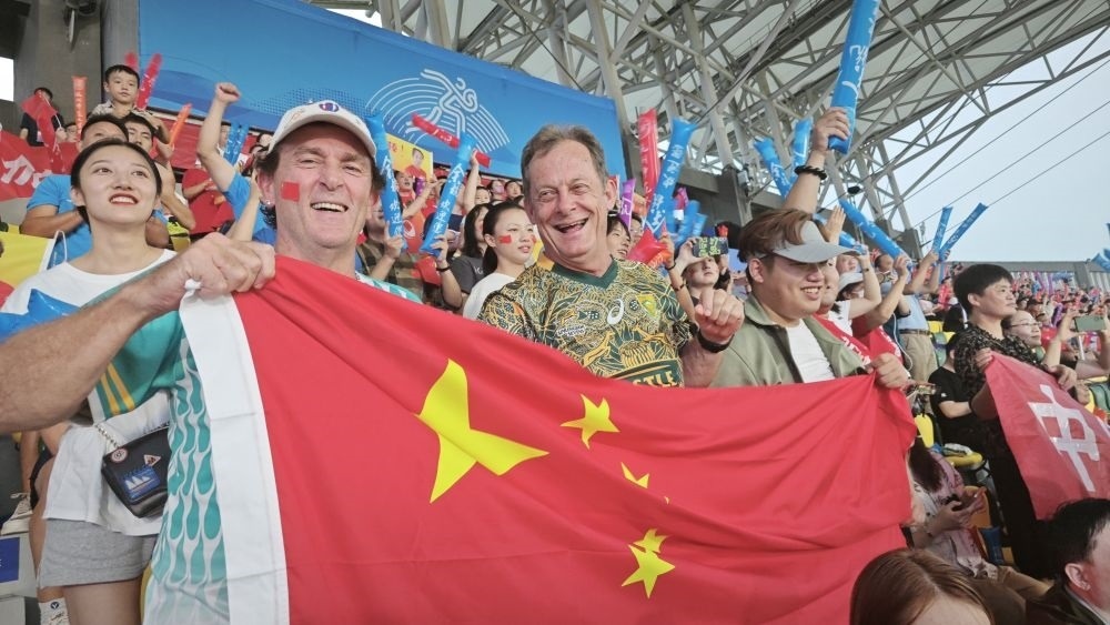 埃里克(左)和本展示五星紅旗,為中國隊(duì)加油