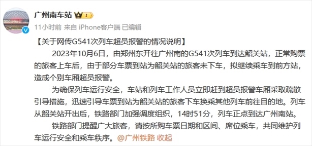 ·廣州南站通報高鐵超員報警:部分到站旅客未下車,擬繼續(xù)乘車到前方站。