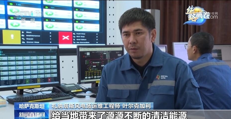 總臺記者 張譽(yù)耀:這里就是札納塔斯,哈薩克斯坦最大的風(fēng)力發(fā)電場之一,像我身后這樣一座風(fēng)能發(fā)電機(jī)能滿足當(dāng)?shù)丶s4000戶家庭的用電需求,而我身后一共有40座這樣的風(fēng)能發(fā)電機(jī),也就是說能夠滿足當(dāng)?shù)?6萬戶家庭的用電需求。正是這一座座轉(zhuǎn)動的風(fēng)能發(fā)電機(jī),點(diǎn)亮了札納塔斯這座小城的日常生活。