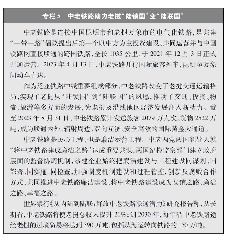 經(jīng)濟(jì)走廊和國際通道建設(shè)卓有成效。共建國家共同推進(jìn)國際骨干通道建設(shè),打造連接亞洲各次區(qū)域以及亞歐非之間的基礎(chǔ)設(shè)施網(wǎng)絡(luò)。中巴經(jīng)濟(jì)走廊方向,重點項目穩(wěn)步推進(jìn),白沙瓦-卡拉奇高速公路(蘇庫爾至木爾坦段)、喀喇昆侖公路二期(赫韋利揚-塔科特段)、拉合爾軌道交通橙線項目竣工通車,薩希瓦爾、卡西姆港、塔爾、胡布等電站保持安全穩(wěn)定運營,默拉直流輸電項目投入商業(yè)運營,卡洛特水電站并網(wǎng)發(fā)電,拉沙卡伊特別經(jīng)濟(jì)區(qū)進(jìn)入全面建設(shè)階段。新亞歐大陸橋經(jīng)濟(jì)走廊方向,匈塞鐵路塞爾維亞貝爾格萊德-諾維薩德段于2022年3月開通運營,匈牙利布達(dá)佩斯-克萊比奧段啟動軌道鋪設(shè)工作;克羅地亞佩列沙茨跨海大橋迎來通車一周年;雙西公路全線貫通;黑山南北高速公路順利建成并投入運營。中國-中南半島經(jīng)濟(jì)走廊方向,中老鐵路全線建成通車且運營成效良好,黃金運輸通道作用日益彰顯;作為中印尼共建“一帶一路”的旗艦項目,時速350公里的雅萬高鐵開通運行;中泰鐵路一期(曼谷-呵叻)簽署線上工程合同,土建工程已開工11個標(biāo)段(其中1個標(biāo)段已完工)。中蒙俄經(jīng)濟(jì)走廊方向,中俄黑河公路橋、同江鐵路橋通車運營,中俄東線天然氣管道正式通氣,中蒙俄中線鐵路升級改造和發(fā)展可行性研究正式啟動。中國-中亞-西亞經(jīng)濟(jì)走廊方向,中吉烏公路運輸線路實現(xiàn)常態(tài)化運行,中國-中亞天然氣管道運行穩(wěn)定,哈薩克斯坦北哈州糧油專線與中歐班列并網(wǎng)運行。孟中印緬經(jīng)濟(jì)走廊方向,中緬原油和天然氣管道建成投產(chǎn),中緬鐵路木姐-曼德勒鐵路完成可行性研究,曼德勒-皎漂鐵路啟動可行性研究,中孟友誼大橋、多哈扎里至科克斯巴扎爾鐵路等項目建設(shè)取得積極進(jìn)展。在非洲,蒙內(nèi)鐵路、亞吉鐵路等先后通車運營,成為拉動?xùn)|非乃至整個非洲國家縱深發(fā)展的重要通道。