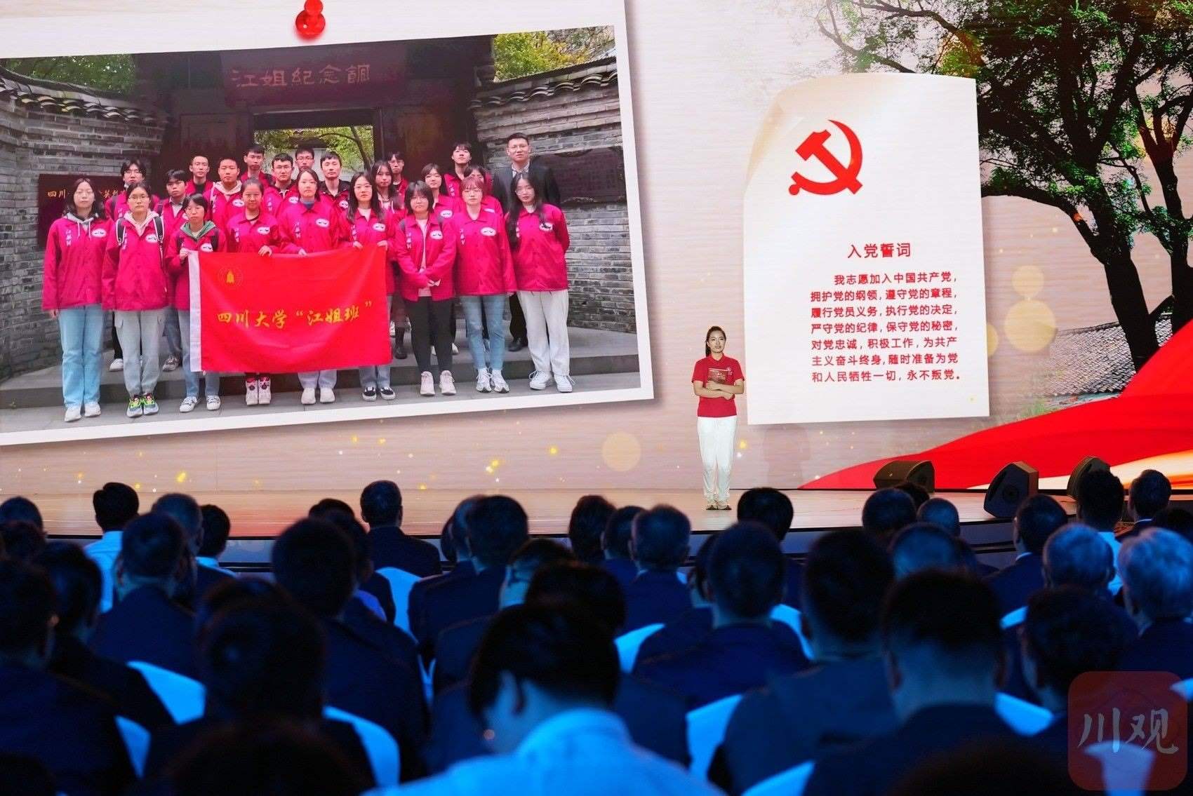 在 “錦水含章”篇章中,以歌曲《紅梅贊》引入,《江姐在川大》編劇冉詩媛、四川大學(xué)“江姐班”學(xué)生代表張鈺、“江姐紀(jì)念館”設(shè)計(jì)者段禹農(nóng)、第49屆南丁格爾獎獲得者蔣艷和四川大學(xué)三星堆遺址考古隊(duì)隊(duì)長黎海超等結(jié)合工作學(xué)習(xí)實(shí)踐,動情講述傳承江姐精神矢志報(bào)國、援外抗疫展現(xiàn)大愛、創(chuàng)新賦能文博考古故事,生動詮釋紅色傳承、文脈賡續(xù)、人民至上。