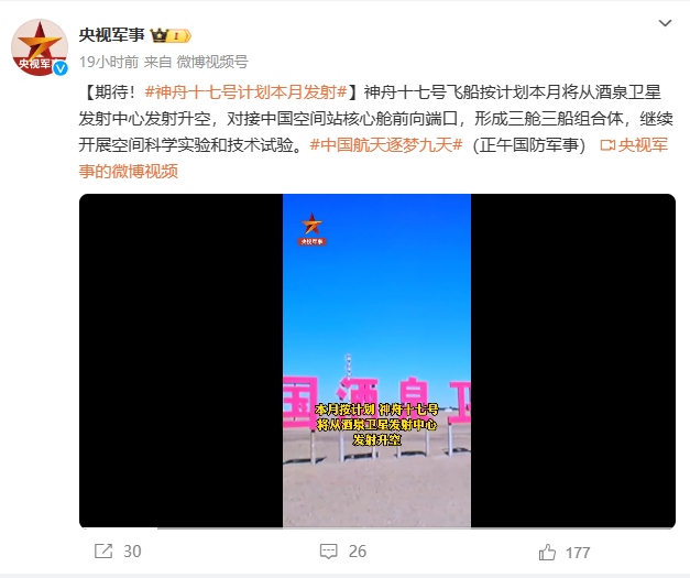 據(jù)“央視軍事”微博賬號報道 神舟十七號飛船按計劃本月(十月)將從酒泉衛(wèi)星發(fā)射中心發(fā)射升空,對接中國空間站核心艙前向端口,形成三艙三船組合體,繼續(xù)開展空間科學實驗和技術(shù)試驗。