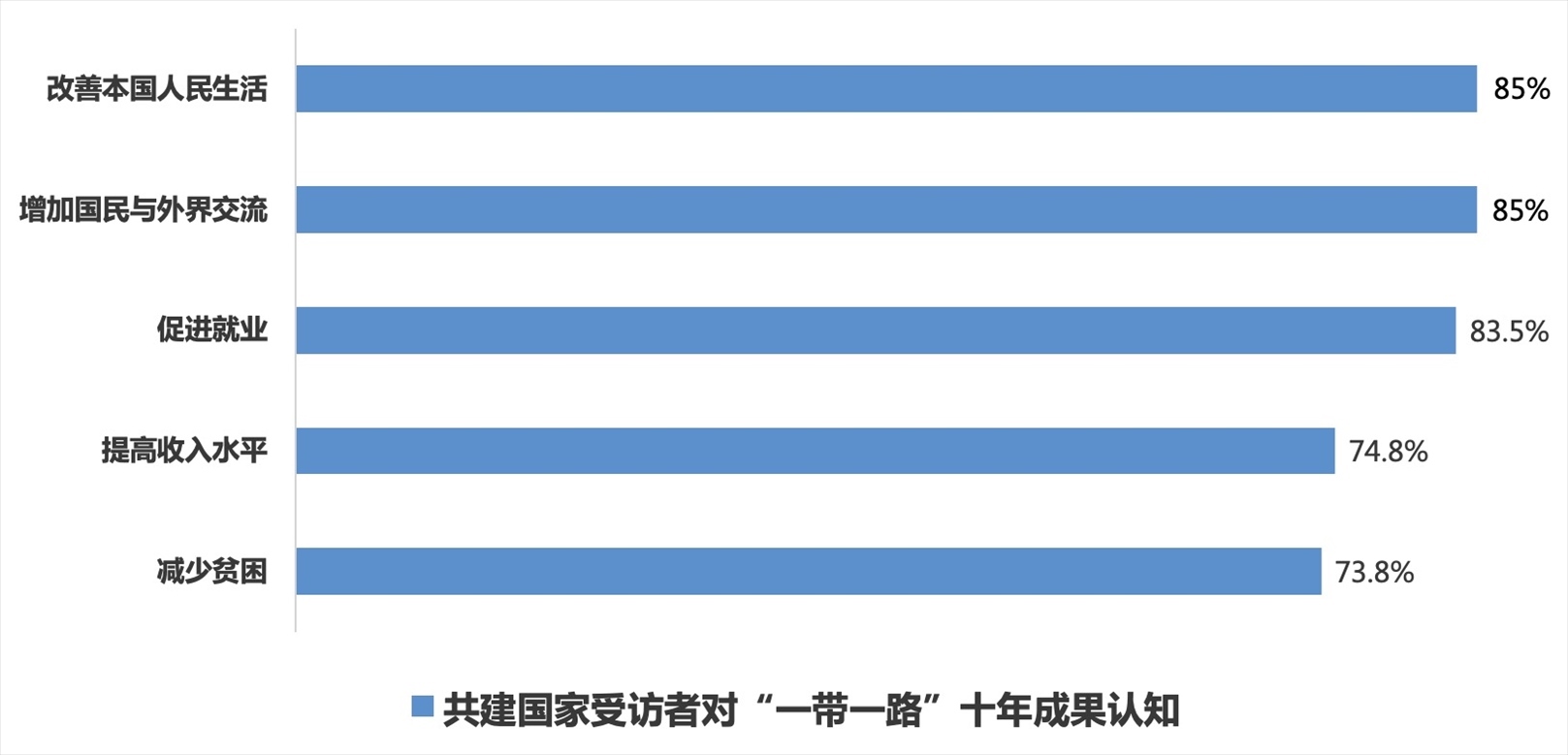 “一帶一路”倡議下一個個“惠而實”的民生工程、民心工程,為各國人民帶來實實在在的獲得感、幸福感和安全感,85%的共建國家受訪者認(rèn)為“一帶一路”切實改善了本國人民的生活;85%的共建國家受訪者認(rèn)為通過“一帶一路”民眾獲得了更多與外界交流互鑒的機會;分別有83.5%、74.8%和73.8%的共建國家受訪者認(rèn)可共建“一帶一路”在促進(jìn)就業(yè)、提高居民收入水平和減少貧困方面的作用;86.5%的共建國家受訪者認(rèn)為“一帶一路”倡議和“以人民為中心”的理念高度契合,惠及全球民眾的愿景正在逐步變?yōu)楝F(xiàn)實。