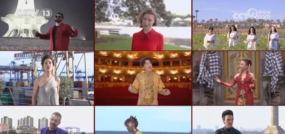 在中國的春節(jié)聯(lián)歡晚會上,來自9個共建“一帶一路”國家的表演者云端相聚,和著中國藝術(shù)家的伴奏共唱《一帶繁花一路歌》。