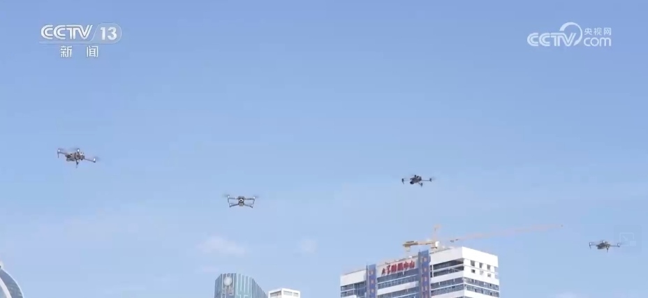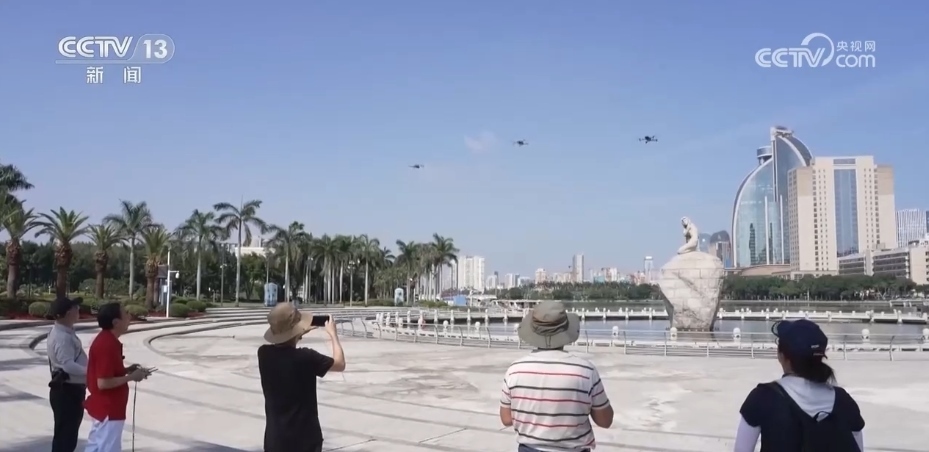 在廈門的白鷺洲上,四架無人機(jī)在空中列隊(duì)一字排開。