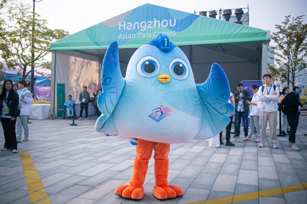10月16日,杭州亞殘運(yùn)會吉祥物“飛飛”在亞殘運(yùn)村開村儀式上。新華社記者 江漢 攝
