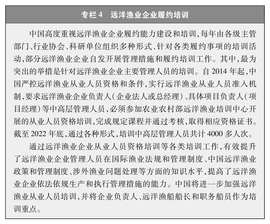 中國遠洋漁業(yè)管理堅持以科學(xué)為基礎(chǔ),建立并完善由主管部門、行業(yè)協(xié)會、科研單位通力合作的管理和履約科技支撐體系,共同制定漁業(yè)管理策略、實施管理措施并對實施效果進行評價。充分發(fā)揮行業(yè)協(xié)會在組織協(xié)調(diào)漁業(yè)生產(chǎn)、規(guī)范企業(yè)行為、組織從業(yè)人員培訓(xùn)、加強行業(yè)自律、推廣示范應(yīng)用等方面的作用,成立遠洋漁業(yè)履約研究中心、遠洋漁業(yè)數(shù)據(jù)中心,完善履約工作機制,加強相關(guān)科研機構(gòu)和智庫建設(shè),逐步提高履約能力和成效。