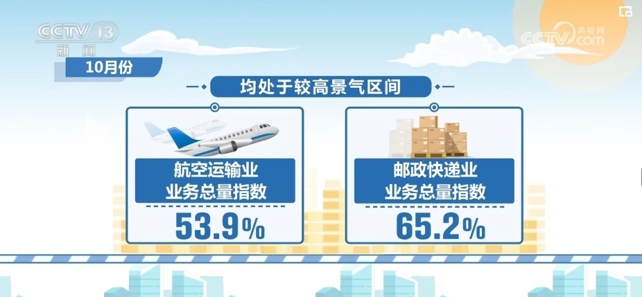 10月份,航空運(yùn)輸業(yè)業(yè)務(wù)總量指數(shù)為53.9%,郵政快遞業(yè)業(yè)務(wù)總量指數(shù)為65.2%,均處于較高景氣區(qū)間。