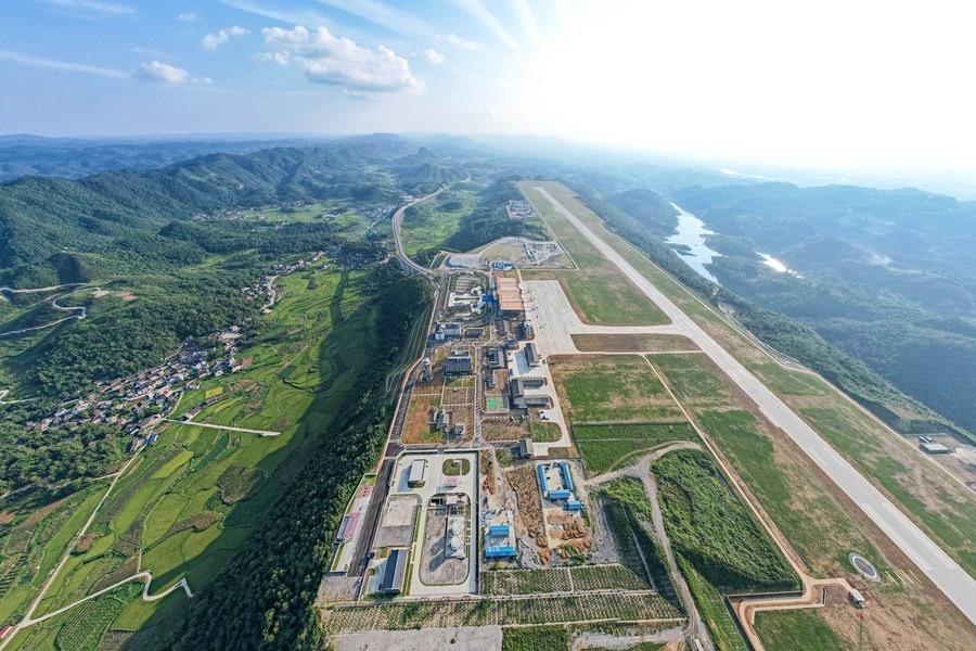 這是8月17日在湖南省湘西土家族苗族自治州花垣縣花垣鎮(zhèn)老天坪村拍攝的湘西邊城機(jī)場(無人機(jī)照片)。新華社記者 陳思汗 攝