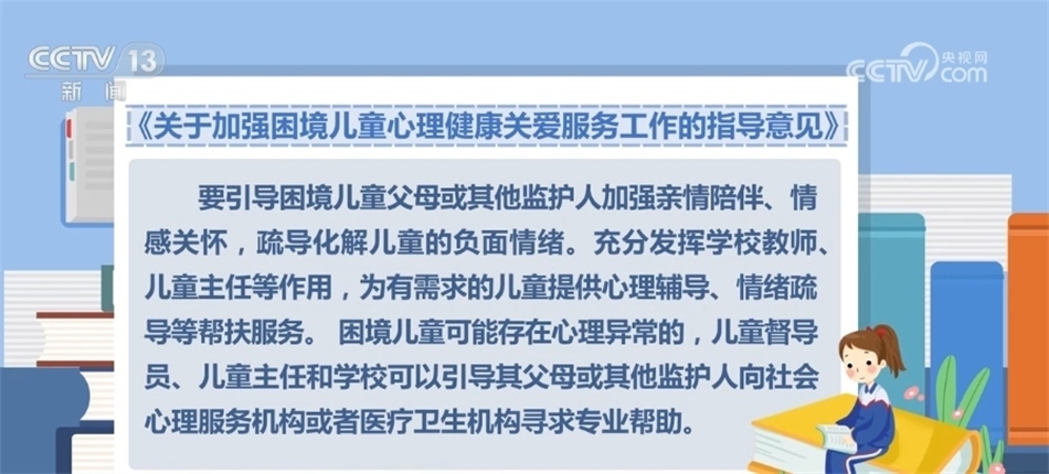 央視網(wǎng)消息:近日,民政部等五部門聯(lián)合印發(fā)《關(guān)于加強(qiáng)困境兒童心理健康關(guān)愛(ài)服務(wù)工作的指導(dǎo)意見(jiàn)》,通過(guò)加強(qiáng)心理健康教育、開(kāi)展心理健康監(jiān)測(cè)等措施,全面提升困境兒童心理健康水平和身心健康素質(zhì)。