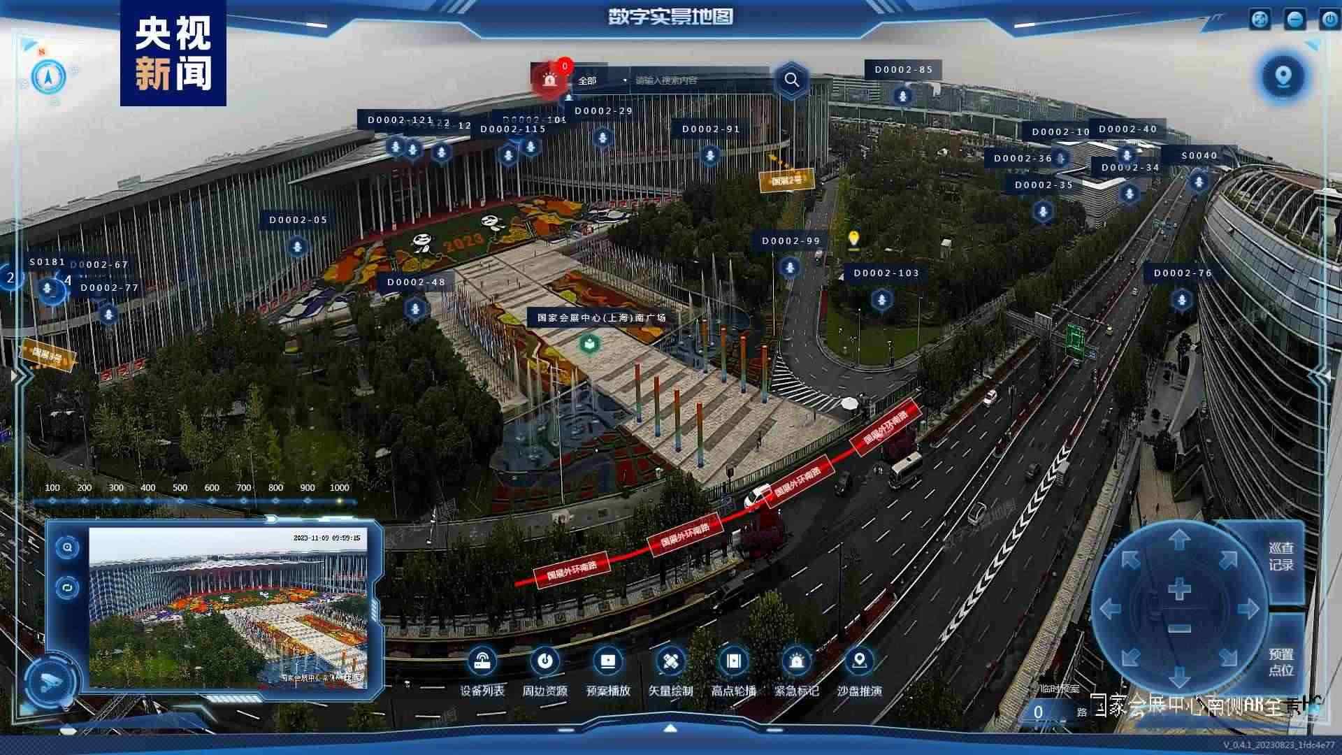 為強(qiáng)化精準(zhǔn)指揮調(diào)度,消防部門專門制作了國家會展中心的三維模型,將本屆參展的1888個展位全部進(jìn)行了數(shù)字化標(biāo)識,在指揮平臺主頁面可實(shí)現(xiàn)目標(biāo)展位一鍵搜索和快速定位。以6.1號館為試點(diǎn),通過激光雷達(dá)和可見光融合傳感器進(jìn)行快速掃描,建立展臺的三維精模,配置安保模型算法,將現(xiàn)場監(jiān)控攝像頭傳回的二維畫面與三維模型匹配,實(shí)現(xiàn)虛實(shí)場景交互融合。同時通過采集巡館人員面部、著裝等特征信息,利用AI算法,實(shí)時在館內(nèi)人群中標(biāo)定巡館人員,進(jìn)行精準(zhǔn)定位。一旦發(fā)現(xiàn)異常狀況,指揮部值班人員能快速、精準(zhǔn)地向所有駐防人員提供最佳處置線路指引和最優(yōu)輔助決策。