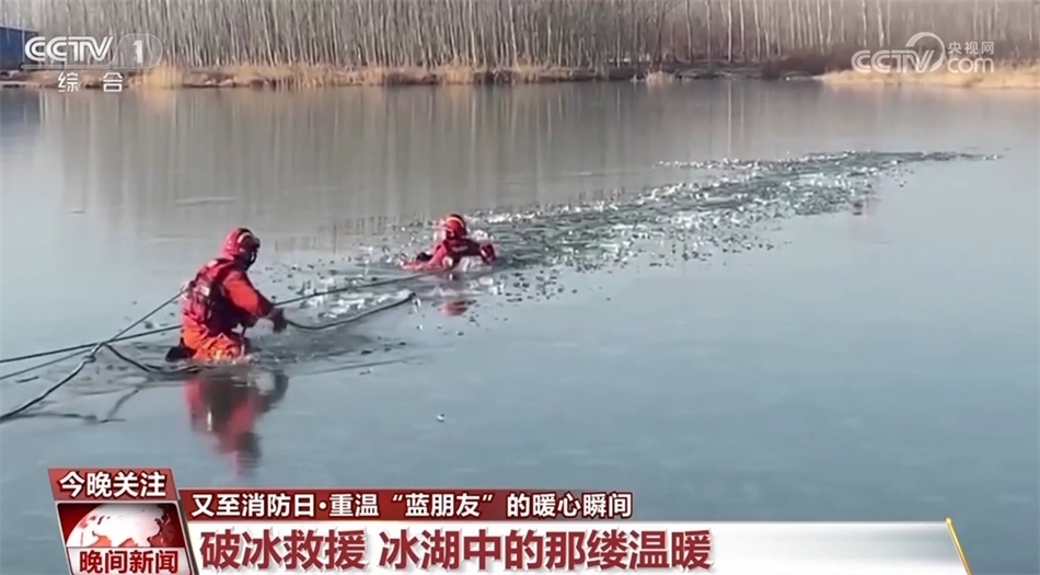 這是在今年年初,冒著凜冽刺骨的低溫,匍匐前進的消防員正在接近落冰者,冰水的浸泡已經使落冰者失去了自主行動的能力,只能靠消防員拖拽向前。
