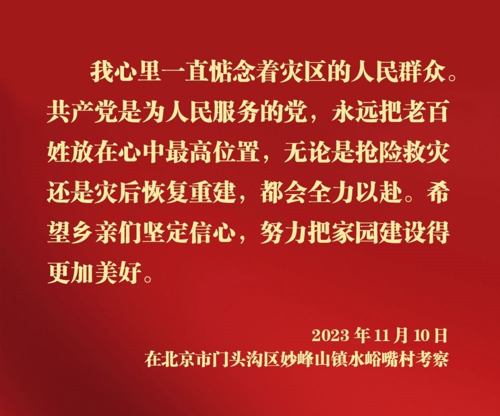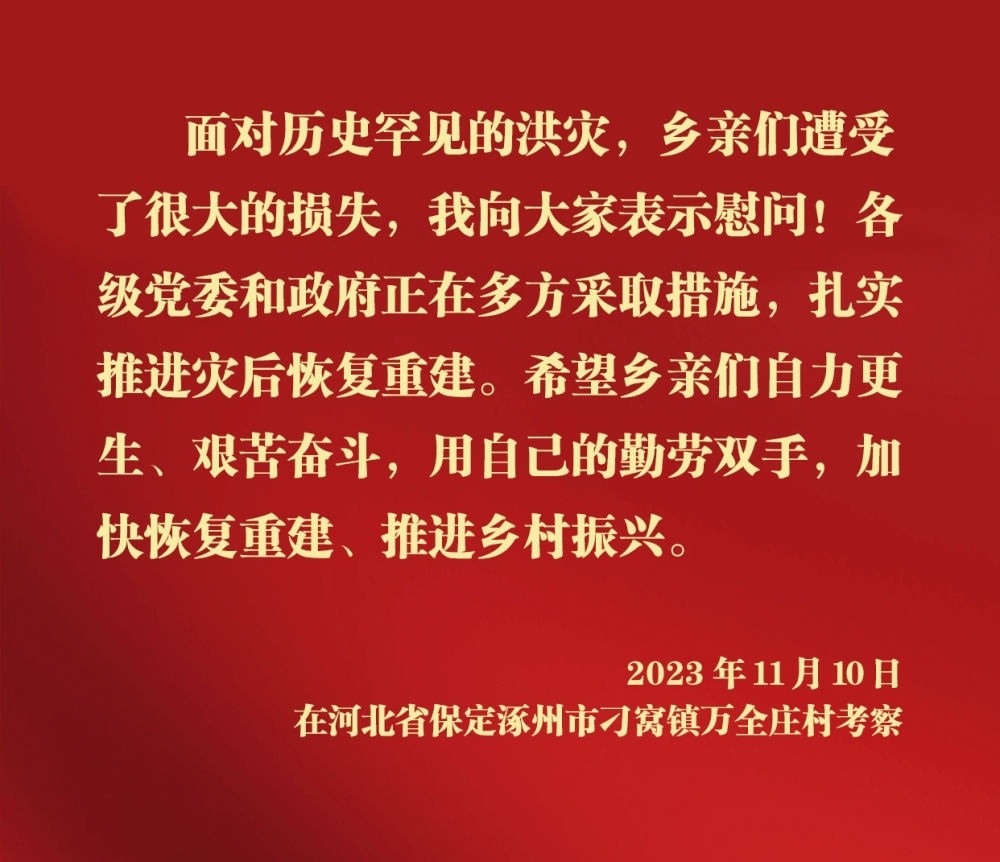 11月10日,中共中央總書記、國家主席、中央軍委主席習近平在北京、河北考察災后恢復重建工作。他先后來到門頭溝、保定等地,實地了解災后恢復重建情況。