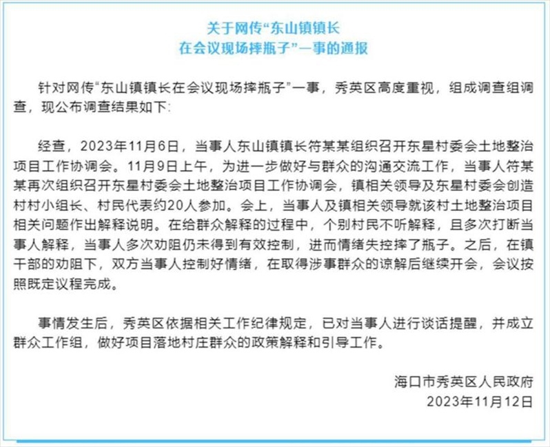 ·海口秀英區(qū)通報(bào)“東山鎮(zhèn)鎮(zhèn)長在會(huì)議現(xiàn)場摔瓶子”:已對(duì)當(dāng)事人進(jìn)行談話提醒。