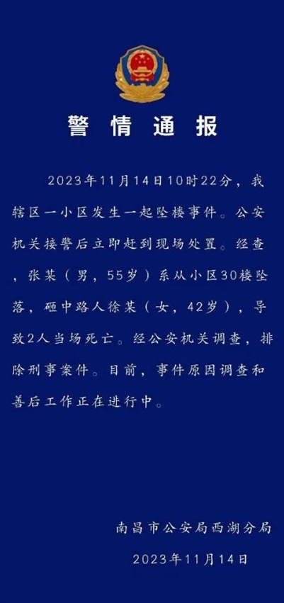 ·南昌警方:男子從小區(qū)30樓墜落砸中女路人,兩人當(dāng)場(chǎng)死亡。