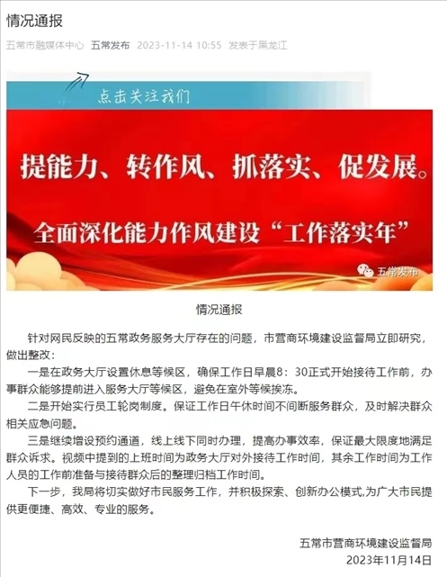 ·黑龍江五常市通報(bào)“政務(wù)大廳全天工作6小時(shí)”:立即做出整改!