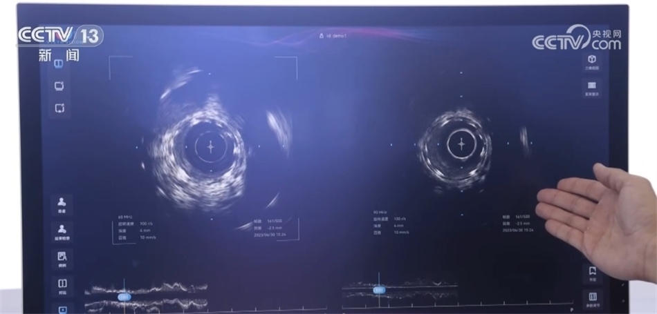 總臺央視記者 褚爾嘉:這里是一個傳統(tǒng)的血管的超聲圖像,我們可以看到血管的全貌。右邊這里是一個工作頻率高達100兆赫茲的超高頻的血管內(nèi)超聲圖像,通過技術升級,現(xiàn)在我們可以更加清晰地看到冠狀動脈的精細結構,這也是目前世界上清晰度最高的一個血管內(nèi)的超聲圖像。