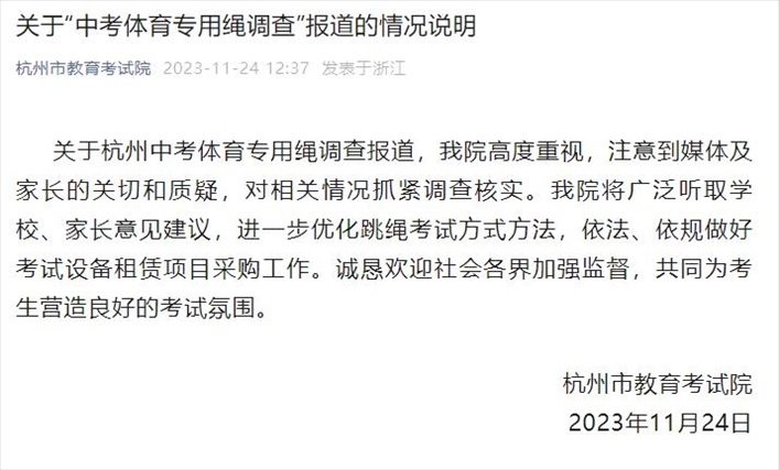·中考體育專用跳繩一根賣78元?杭州市教育考試院回應(yīng):抓緊調(diào)查核實。