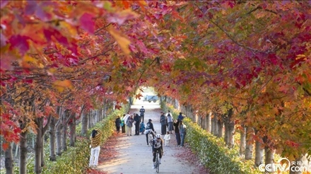 2023年11月24日,蘇州工業(yè)園區(qū)陽澄湖半島莆田有機農(nóng)業(yè)園紅楓大道上的紅葉燦爛如霞,已到最佳觀賞期,吸引游客前來賞楓。