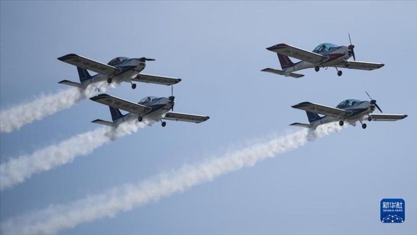 11月23日,山河飛行表演隊在2023亞洲通用航空展開幕式上進行飛行表演。