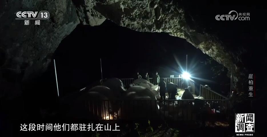 調(diào)查用的工具、保險繩、干糧、帳篷,僅僅是這些必需品,他們的背包就有好幾十斤重。無人區(qū)里沒有路,沿途基本都是密集的樹林和雜草,隊(duì)員們只能用砍刀開路。有些崖壁是直接懸空的,根本沒有著力點(diǎn)。隊(duì)員們就從山林里找來廢棄的木頭,用鐵絲捆在一起,搭成木橋和圍欄。走了四個多小時,他們終于在一處懸崖發(fā)現(xiàn)了野生崖柏。他們手中的儀器叫做定位器,可以精確記錄崖柏生長地點(diǎn)的經(jīng)緯度和海拔,給科研提供更精確的信息。