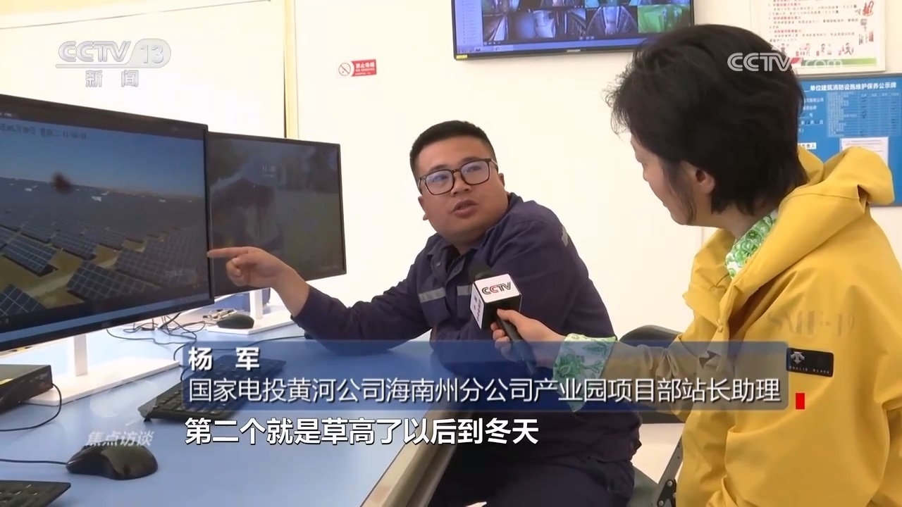 國家電投黃河公司海南州分公司產(chǎn)業(yè)園項目部站長助理楊軍:“光伏板下面這些羊,就是我們請過來幫忙除草的。因為每年一到夏天,園區(qū)電池組件下面草就特別高,長高了以后會遮擋電池組件,一個是影響發(fā)電效率,再一個秋冬季有火災(zāi)隱患。”