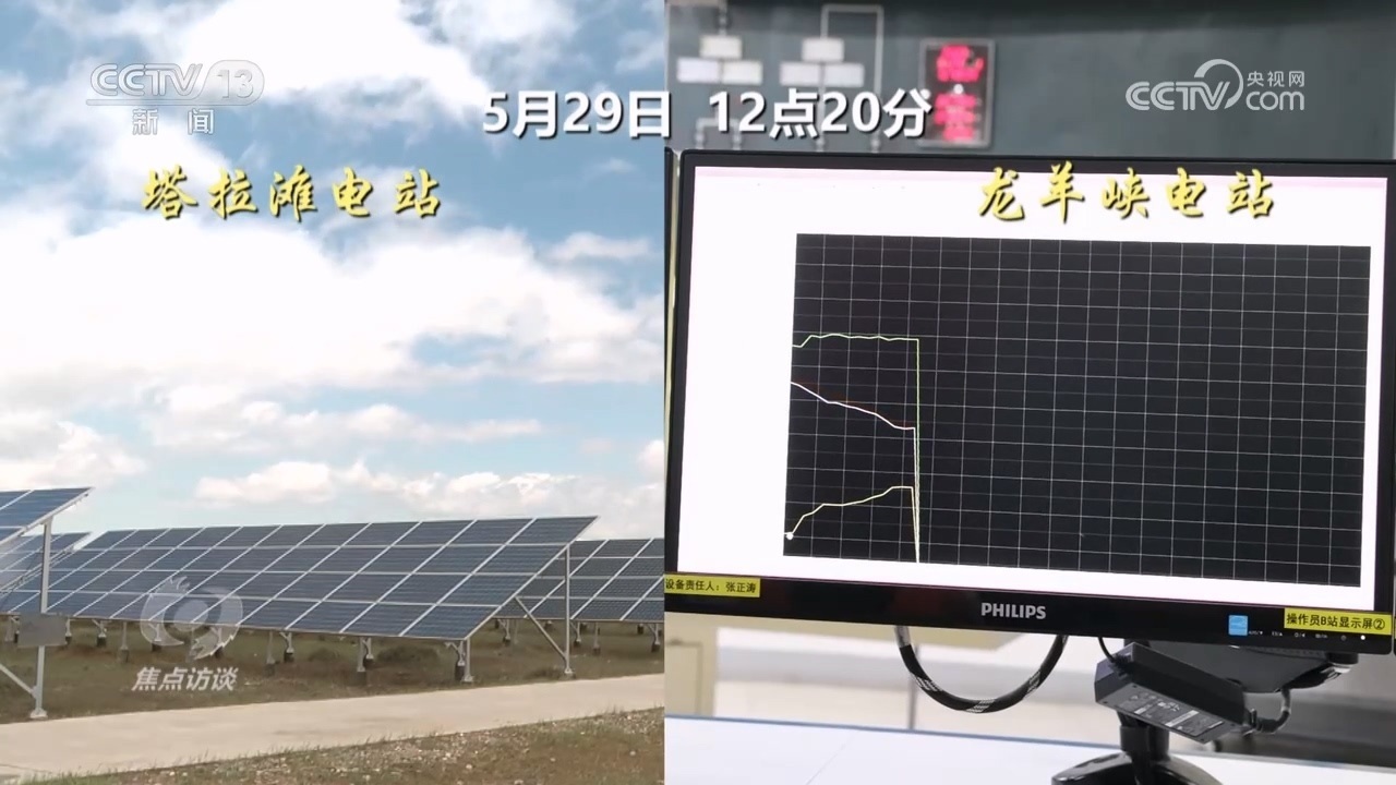 這一天,記者在龍羊峽水電站見到了水電光伏互補(bǔ)的實時情況。12點20分開始,50公里外塔拉灘光伏現(xiàn)場拍攝的影像顯示,有一大片云經(jīng)過光伏電站,光伏發(fā)電輸出立即發(fā)生了變化。這個數(shù)據(jù)變化實時傳到水電站的水光互補(bǔ)系統(tǒng)。