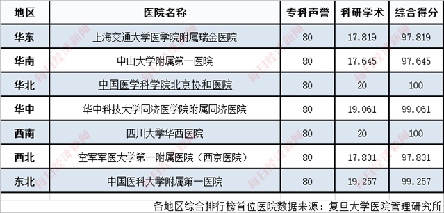 分地區(qū)看,中國醫(yī)學(xué)科學(xué)院北京協(xié)和醫(yī)院和四川大學(xué)華西醫(yī)院分別以專科聲譽(yù)(80)、科研學(xué)術(shù)(20)雙滿分的成績(jī)領(lǐng)跑華北地區(qū)、西南地區(qū)的綜合排行榜,中國醫(yī)科大學(xué)附屬第一醫(yī)院和華中科技大學(xué)同濟(jì)醫(yī)學(xué)院附屬同濟(jì)醫(yī)院則分別以99.257和99.061的成績(jī)領(lǐng)跑東北地區(qū)和華中地區(qū)。此外,上海交通大學(xué)醫(yī)學(xué)院附屬瑞金醫(yī)院、中山大學(xué)附屬第一醫(yī)院、空軍軍醫(yī)大學(xué)第一附屬醫(yī)院(西京醫(yī)院)也分別在各地區(qū)的綜合排行榜中位列首位。