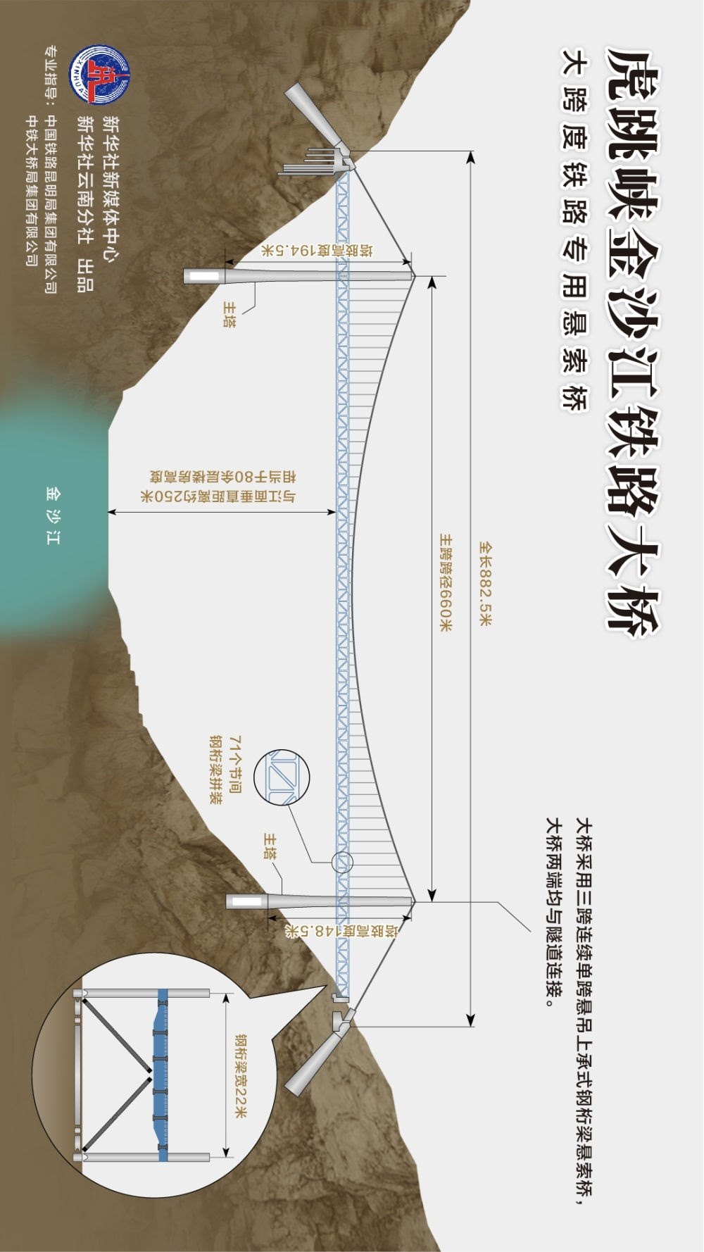 虎跳峽金沙江鐵路大橋,全長(zhǎng)882.5米,主跨跨徑660米,兩端均與隧道連接。大橋主纜跨度大、鋼梁自重大,兩岸山坡陡峭,施工場(chǎng)地有限。