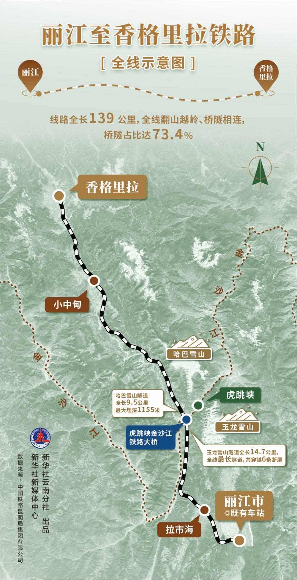 2023年11月26日,麗江至香格里拉鐵路正式開通運(yùn)營(yíng),鐵路全長(zhǎng)139公里,設(shè)計(jì)時(shí)速140公里,為國(guó)家I級(jí)單線電氣化鐵路,兩地間最快1小時(shí)18分可達(dá)。