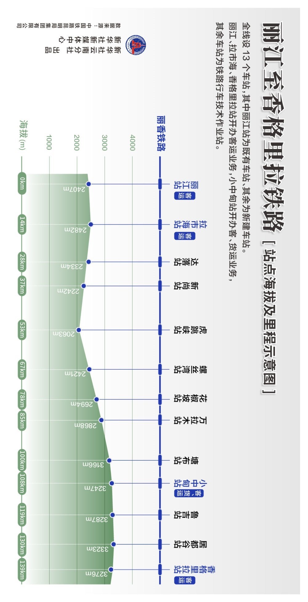 全線共設(shè)有13個(gè)車站,其中麗江站為既有車站,其余為新建車站。麗江、拉市海、香格里拉站開辦客運(yùn)業(yè)務(wù),小中甸站開辦客、貨運(yùn)業(yè)務(wù),其余車站為鐵路行車技術(shù)作業(yè)站。