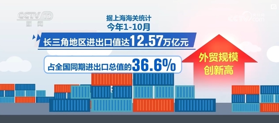 據(jù)上海海關(guān)統(tǒng)計,2023年1—10月,長三角地區(qū)進(jìn)出口值達(dá)12.57萬億元,占全國同期進(jìn)出口總值的36.6%,外貿(mào)規(guī)模創(chuàng)新高。