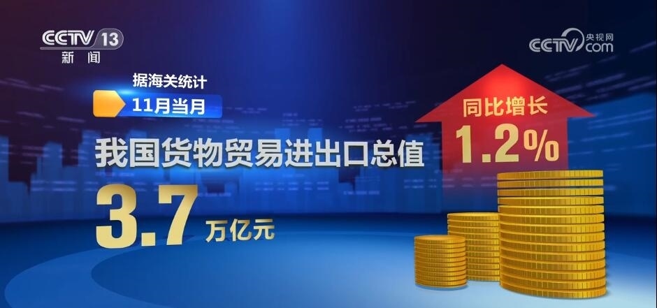 央視網(wǎng)消息:海關(guān)總署今天(12月7日)對外公布,今年11月份,我國貨物貿(mào)易進出口總值3.7萬億元,同比增長1.2%。數(shù)據(jù)顯示,我國外貿(mào)穩(wěn)中向好態(tài)勢進一步鞏固。