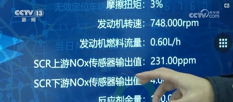 在另外一間實驗室,這塊大屏幕連接著全國308萬國6柴油車,每輛車發(fā)動機的工作狀態(tài)和污染物的排放裝置是否正常運行一目了然。