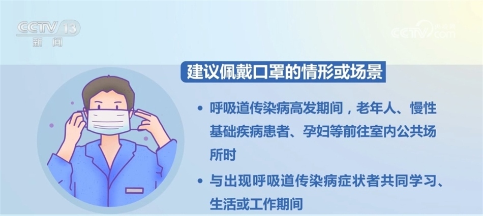 建議佩戴口罩的情形或場(chǎng)景包括:呼吸道傳染病高發(fā)期間,乘坐飛機(jī)、火車(chē)、長(zhǎng)途車(chē)、輪船、地鐵、公交車(chē)等公共交通工具時(shí)。呼吸道傳染病高發(fā)期間,進(jìn)入超市、影劇院、客運(yùn)場(chǎng)站、廂式電梯等環(huán)境密閉、人員密集場(chǎng)所時(shí)。呼吸道傳染病高發(fā)期間,老年人、慢性基礎(chǔ)疾病患者、孕婦等前往室內(nèi)公共場(chǎng)所時(shí)。與出現(xiàn)呼吸道傳染病癥狀者共同學(xué)習(xí)、生活或工作期間。