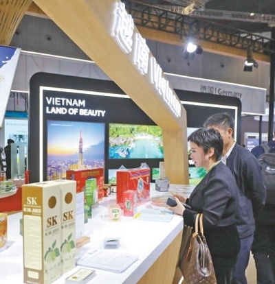 11月6日,參觀者在第六屆進博會國家展越南展臺挑選商品。新華社記者 李夢嬌攝