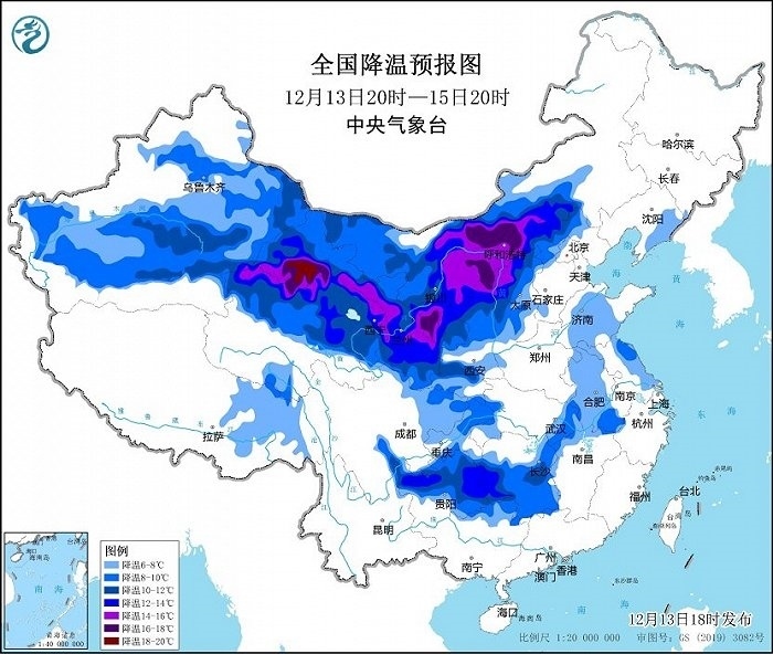 其中,12月13日20時至12月15日20時,新疆中東部、內(nèi)蒙古中西部、甘肅、寧夏、青海、陜西中北部、山西北部等地將出現(xiàn)8~12℃降溫,甘肅、內(nèi)蒙古河套地區(qū)、陜西北部局地降溫可達(dá)14℃以上。